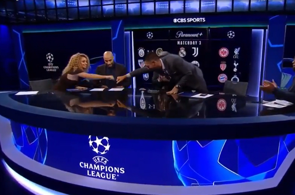 La presentadora de CBS Sports, Kate Scott, protagonizó un momento inesperado durante la retransmisión en directo de la UEFA Champions League cuando, al saludar con el puño al exfutbolista Clint Dempsey, su blusa se rasgó por un costado en plena apertura del segmento. El gesto fue rápido y espontáneo: Scott miró a cámara, cubrió el desgarro con naturalidad y soltó una frase entre risas que descomprimió el ambiente, mientras el resto del panel —incluidos analistas de primer nivel— no pudo evitar sonreír ante la escena.