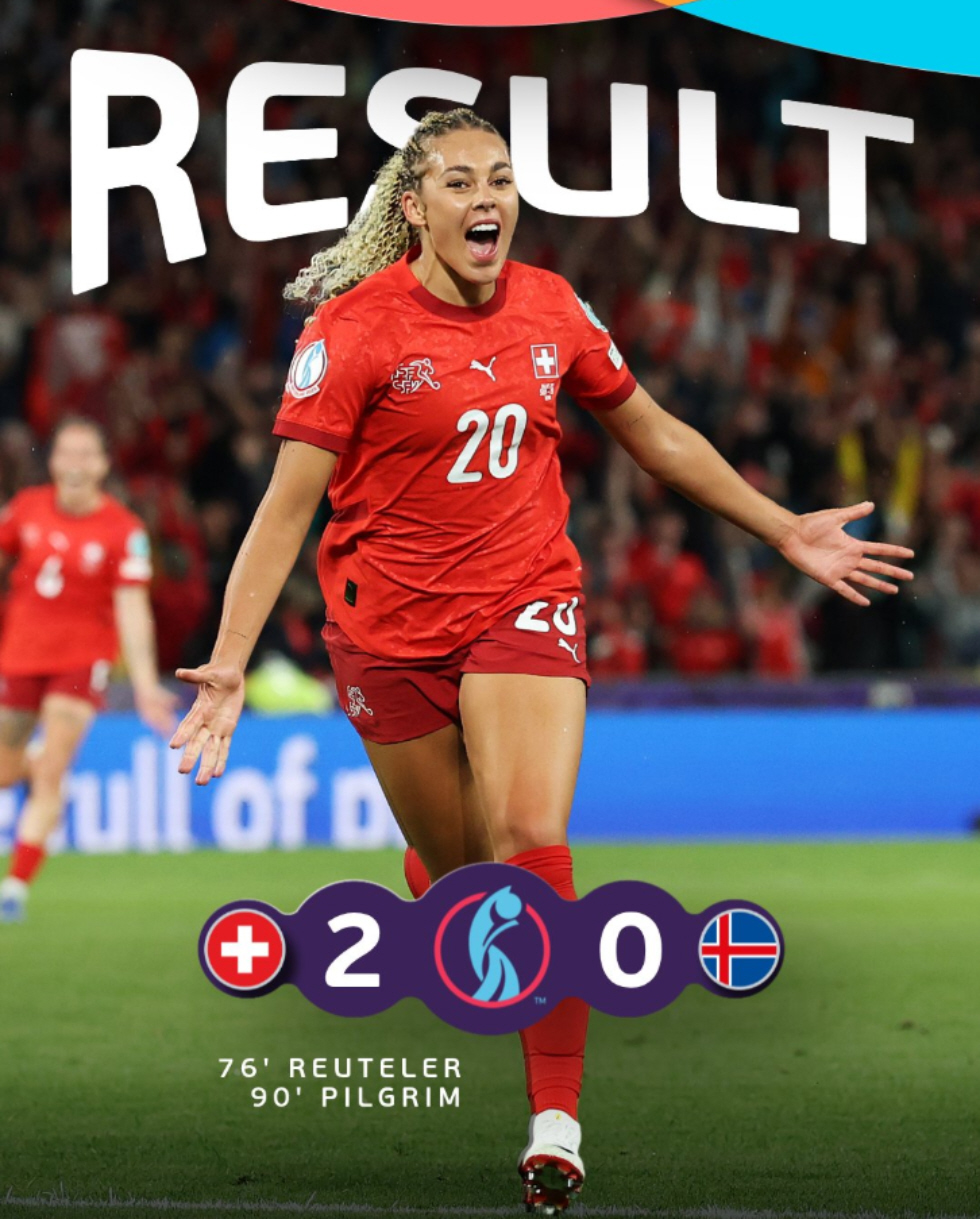 Los anfitriones vencieron a Islandia 2-0 (0-0) el domingo y tienen una buena oportunidad de llegar a los cuartos de final. Los goles ante 29.658 espectadores en Berna fueron marcados por Geraldine Reuteler (76º) y Alayah Pilgrim (90º). Los islandeses le dieron a Suiza un juego equilibrado durante mucho tiempo. Ingibjörg Sigurdardottir estrelló el balón en el larguero en el primer minuto tras un saque de banda largo.