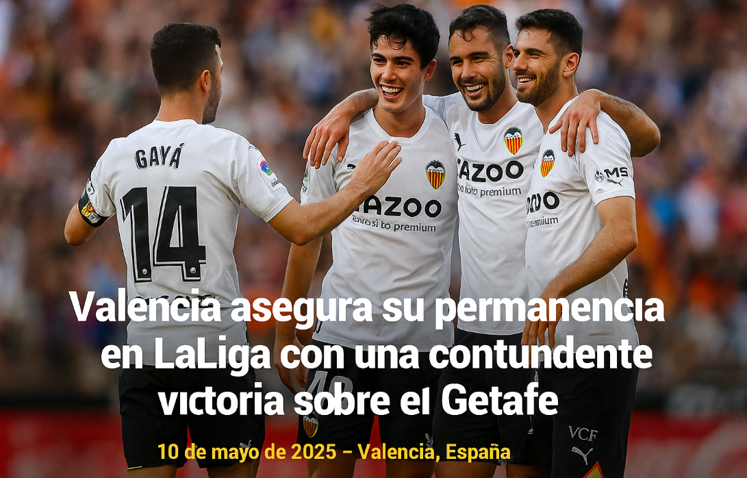 El Valencia CF logró una importante victoria de 3-0 frente al Getafe en Mestalla, correspondiente a la jornada 35 de LaLiga EA Sports. Con este resultado, el equipo dirigido por Carlos Corberán garantiza su permanencia en la Primera División y mantiene vivas sus aspiraciones de clasificar a competiciones europeas.