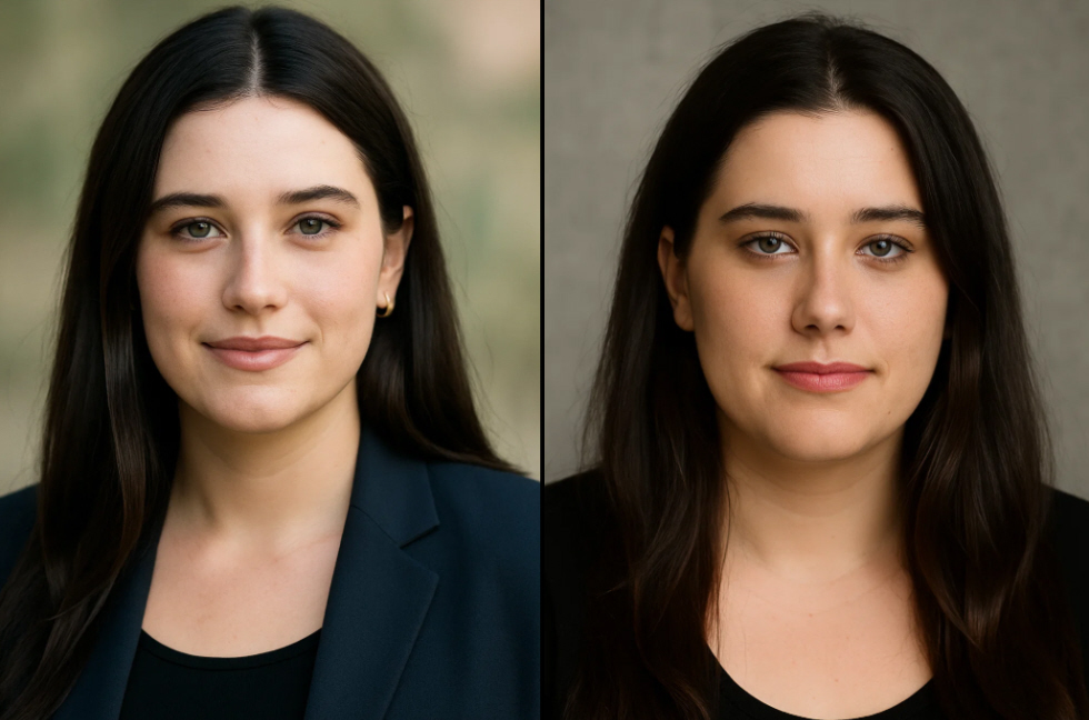 En la fotografía, Ella posa con un look sofisticado y minimalista, usando un abrigo negro de corte largo que domina la composición. Con el cabello recogido hacia atrás y una expresión serena y segura, la actriz transmite una presencia fuerte, madura y artística.