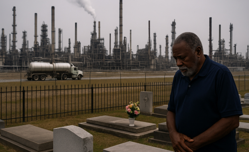 Sin embargo, ese progreso tiene un costo terrible: los residentes de la región mueren de cáncer a un ritmo alarmante. La zona es hoy tristemente conocida como “Cancer Alley” o “Callejón del Cáncer”. Las escenas cotidianas revelan el contraste brutal: chimeneas industriales que escupen humo en el horizonte, el rugir de los vehículos pesados recorriendo las carreteras, y, en primer plano, cementerios que parecen recordar la tragedia humana que se vive en la región. Robert Taylor, un hombre de 84 años, compartió su historia de dolor durante una visita a la tumba de su difunta esposa.
